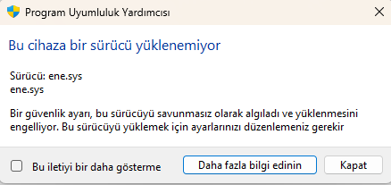 Arkadaşlar W11 de dün bir Update yapıp bilgisayarı kapattım, sabah açtığımda ''ene.sys" sürücüsünü kurarken " bu sürücüyü savunmasız algıladı" hatası ile karşılaştım sorunun çözümü nedir?