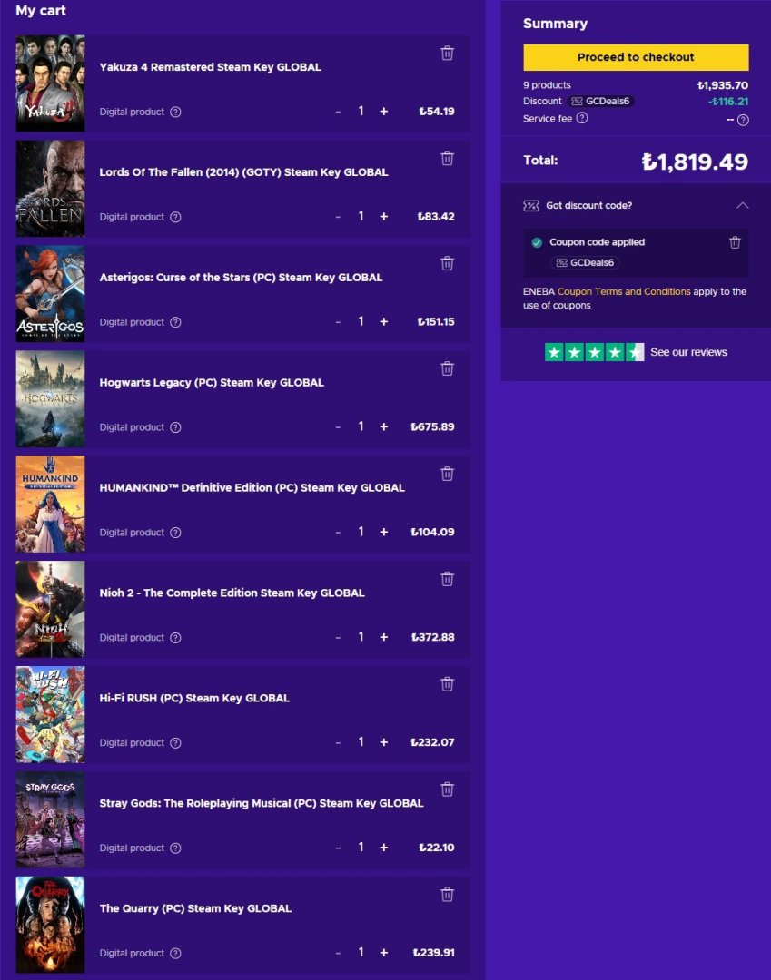 Steam dolar üzerinden satışa geçtiğinden beridir hiç satın alma yapmamıştım. Ürün anahtarı olarak Eneba'ya bir bakayım dedim, Steam'e göre indirimli halinden bile ucuza gelen oyunlar olduğunu gördüm. Kendime göre de bir alışveriş yaparken kod önerisi kullandım.