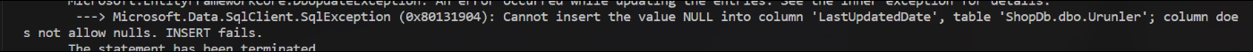 Öncelikle hatayı okumak lazım. Hata cümlesi bize diyor ki; "NULL değer "LastUpdatedDate" sütununa eklenemez; Sütun null kabul etmiyor. INSERT başarısız."Cannot insert the value NULL into column "LastUpdatedDate", table ShopDb.dbo.Urunler; Column does not allow nulls. INSERT fails.