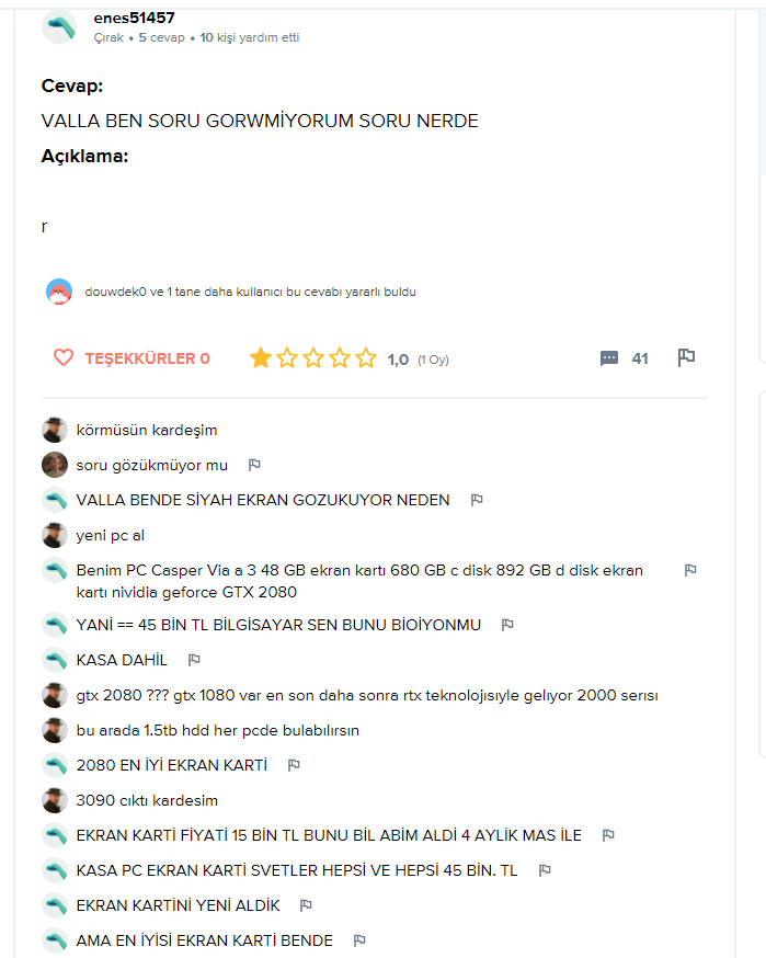 20 yıllık teknoloji hayatımda çok bilgisiz insan gördüm bunun kadarını görmedim ya. Bunları gördükçe donanımlara, teknolojiye küsüyorum. Bu çocuk kesinlikle İ7 var diye (1. nesil olan şu) TurboX falanda alır ha.