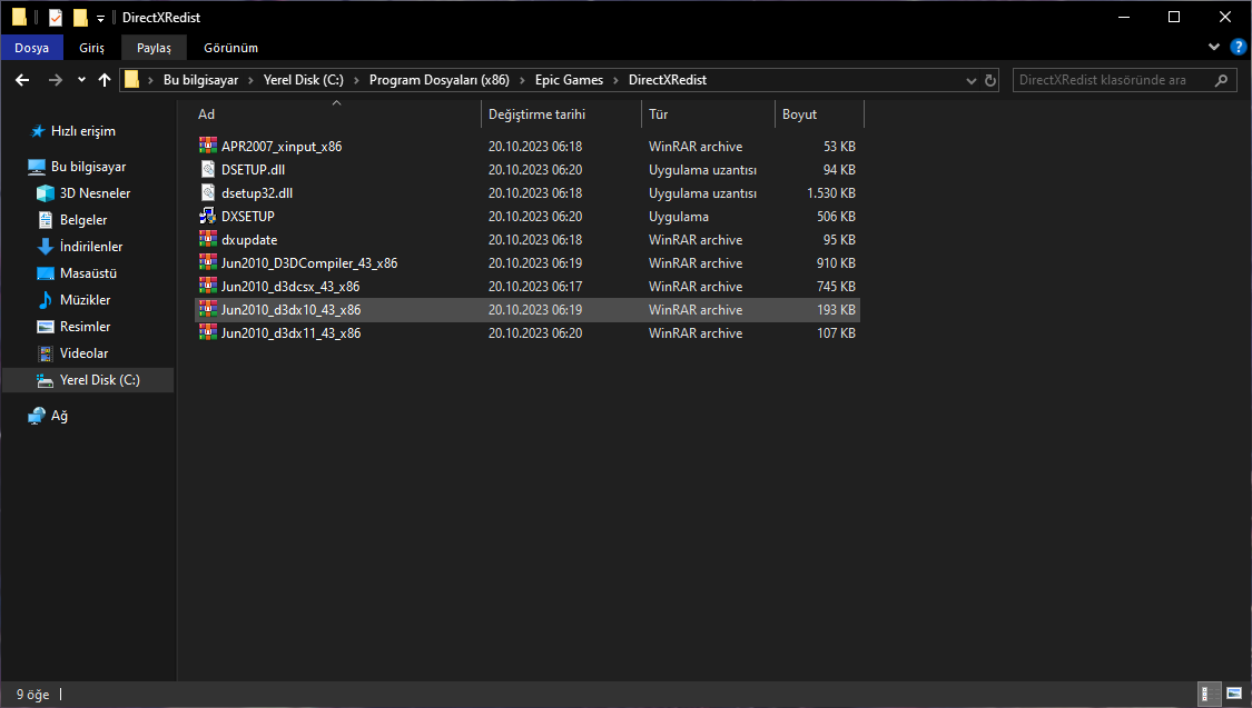 2: Açtığımız klasörde DirectXRedist klasörünün içine girip içinde ki .dll 'leri tek tek masaüstüne boş bir klasör açıp kopyalıyoruz. Toplamda 8 adet .dll olması lazım.