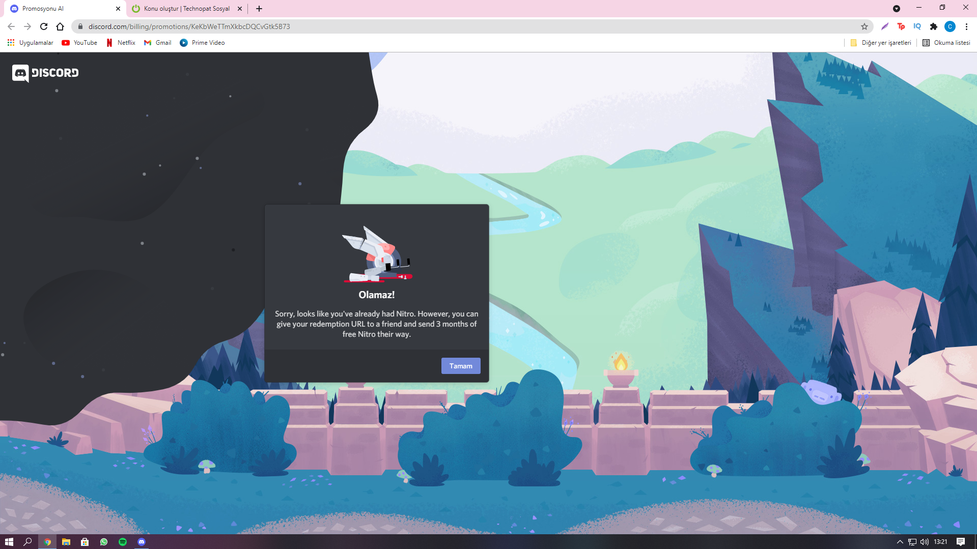 Merhaba, mail adresime Discord Nitro için link geldi ancak tıkladığım zaman bu hatayı veriyor fakat Discord hesabımda nitro yok.