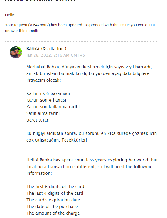 Xsolla.com adresine de yazdım orada kartımın bilgilerini istiyor, güvenemedim.