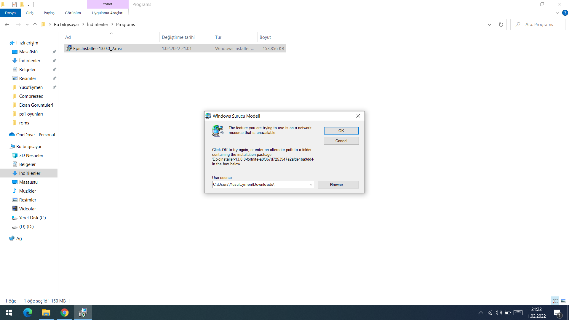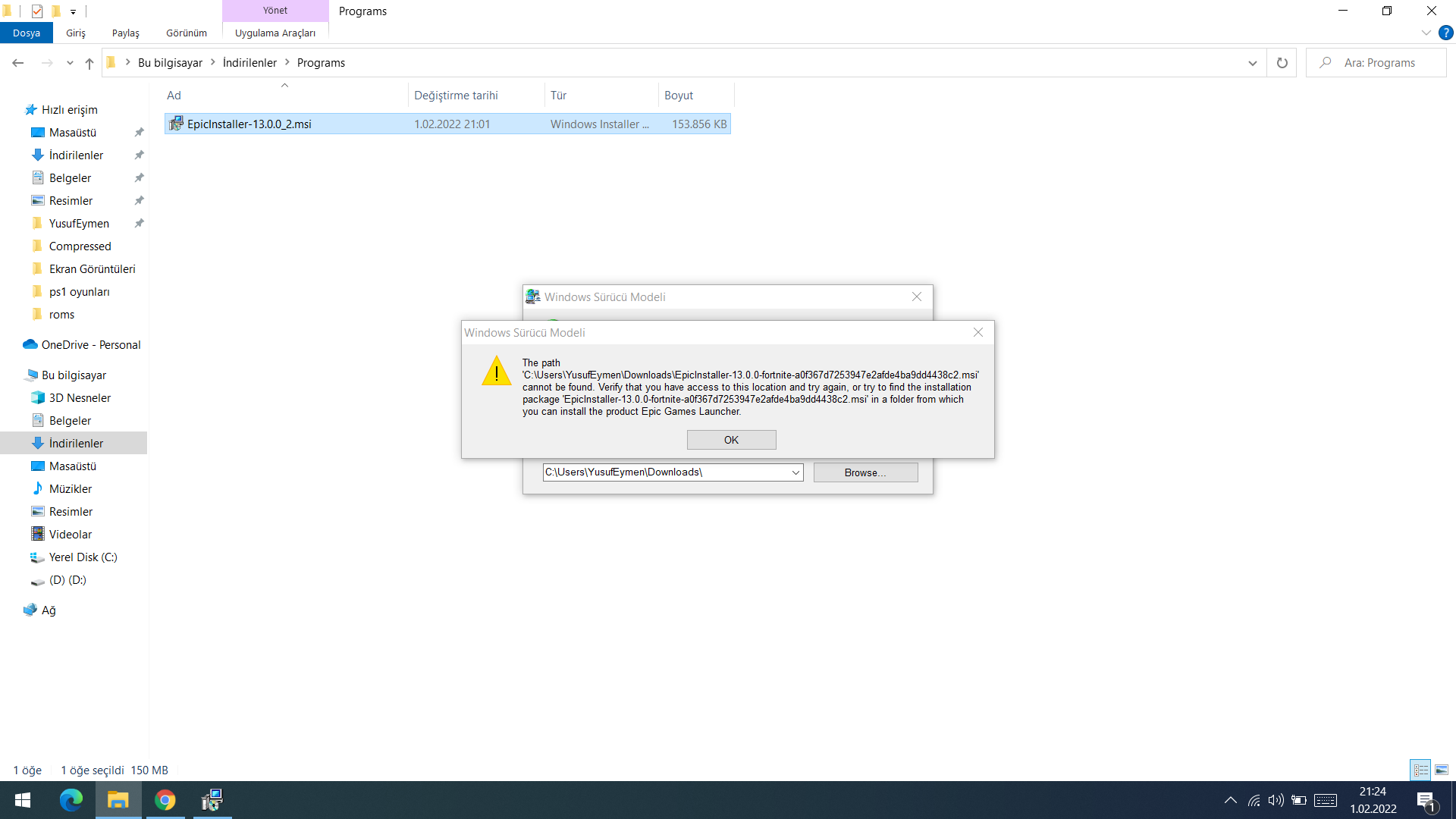 Epic Games'i sıhırbazını actıktan sonra boyle bır ekranla karsılasıyorum ok a tıklayınca boyle bir hata alıyorum: