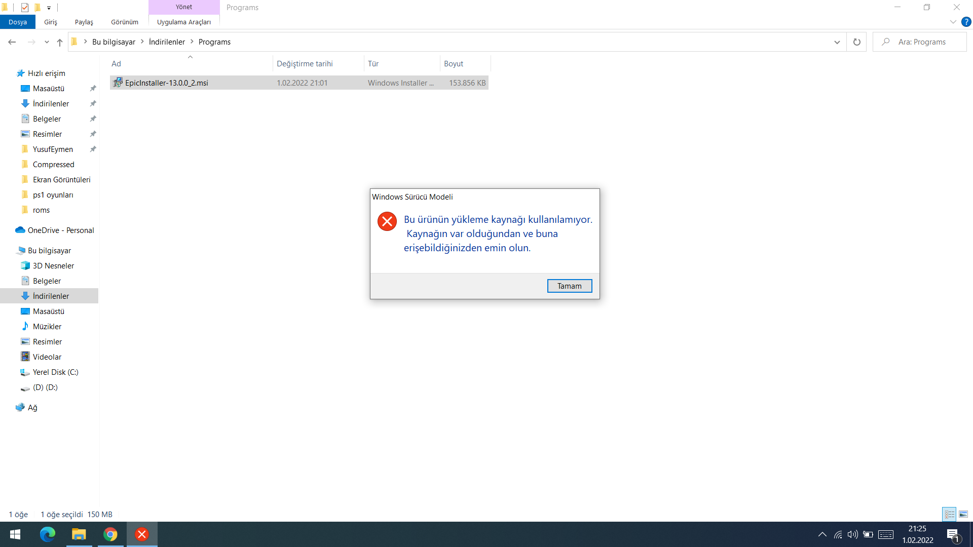 Dosya konumu başka bir bölümde o yüzden doğrulanamıyor galiba önceden yükleyip sildiyseniz o artıkları seçiyor olabilir program yardımıyla arta kalanları silin sonra tekrar masaüstüne atıp kurmayı deneyin.