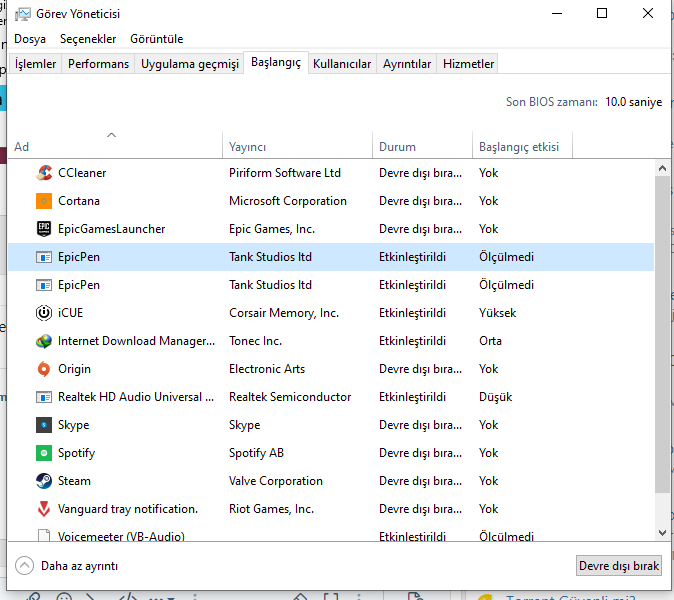Arkadaşlar, Epic Pen yükledim ve tüm başlatma ayarlarını yaptım. Görev yöneticisindeki başlangıçta etkin, resimdeki oturum başlangıç tuşunu açınca PC'yi başlattığım zaman başlıyor ama başladıktan sonra o tike bakıyorum, kendi kendine kapanmış oluyor, sonraki seferler kendisi açılmıyor. Arkadaşımda böyle bir sorun yok, bende var.