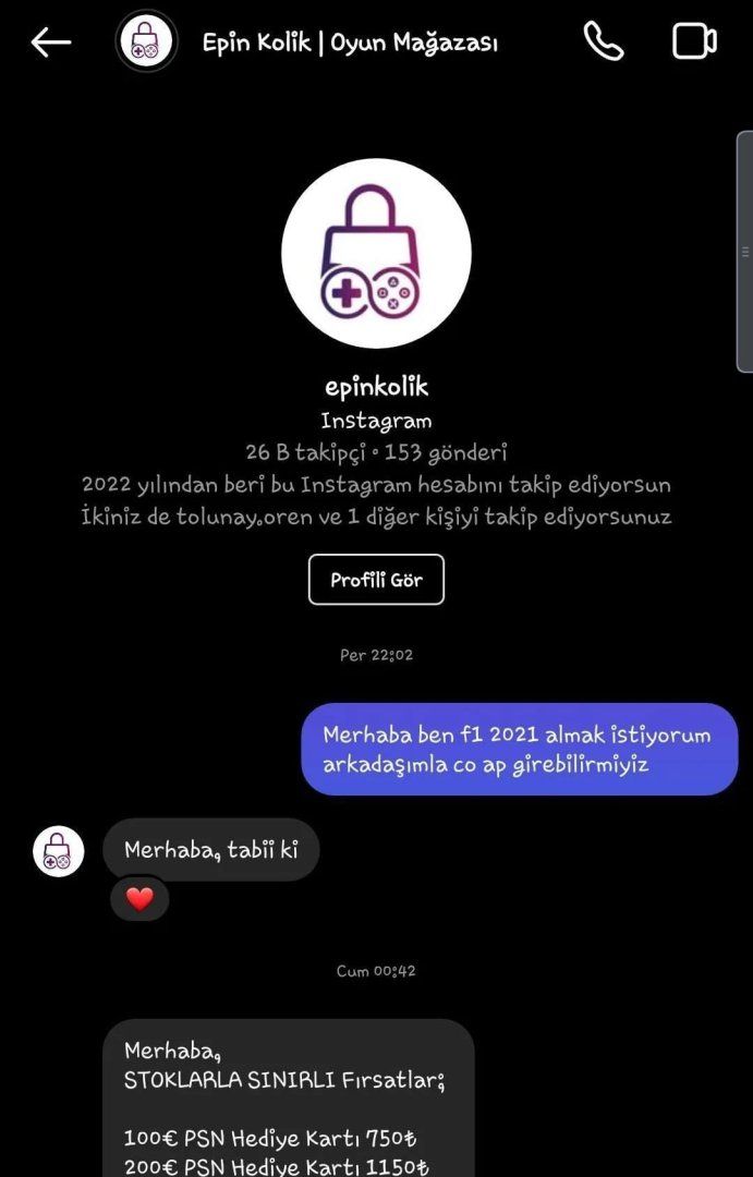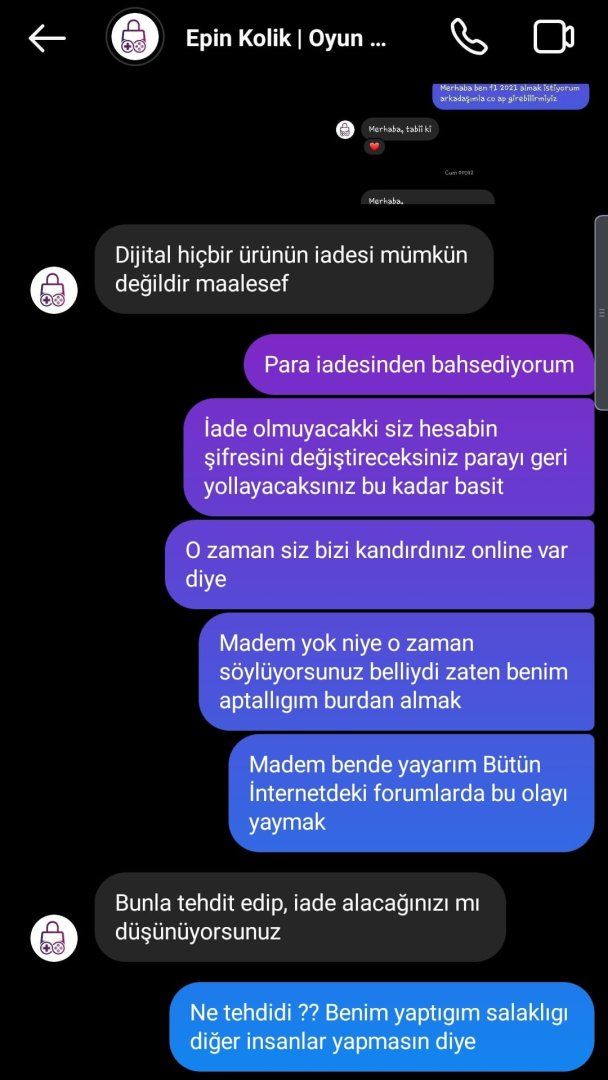 Bugün arkadaşımla epin kolik Instagram hesabından F1 2021 almak istedim ve Online girilebiliyor mu? Diye sordum ve evet, tabii ki dendi ve ondan sonra aldım hesaba giriş yaptığımda Online olarak girilemeyeceğini sadece çevrim dışı oynayabileceğimi gördüm ve sorduğumda sadece görüldü attılar. Sonrasında iade istedim ve dijital ürünlerde iade olmayacağını söylediler ve bende öylece kaldım. Aşağıya konusma SS'lerini koyacağım sizde bu tarz adamlardan almayın bana ders olsun. Kısaca dolandırılma hikayesi.