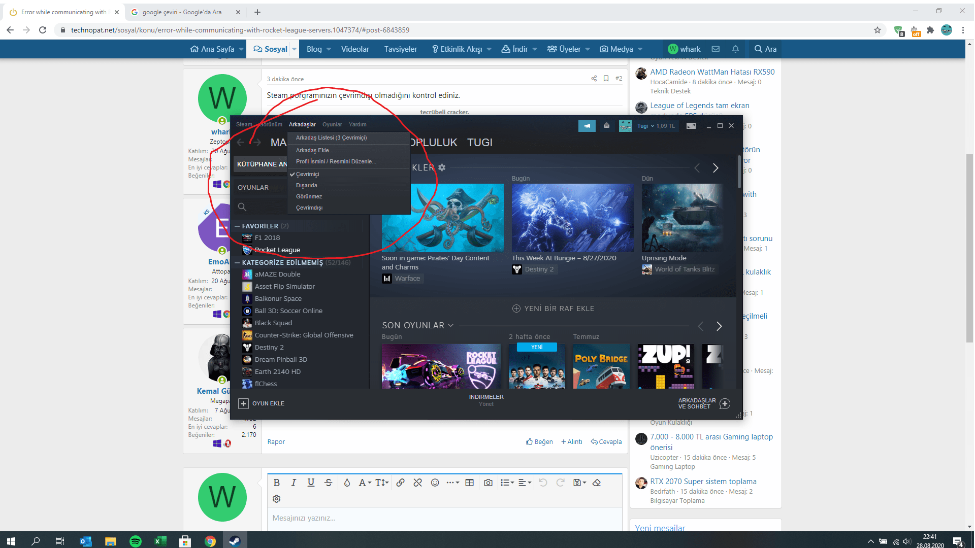Merhabalar benim Rocket League'de " error while communicating with Rocket League servers " hatası geliyor. Oyun orijinal.