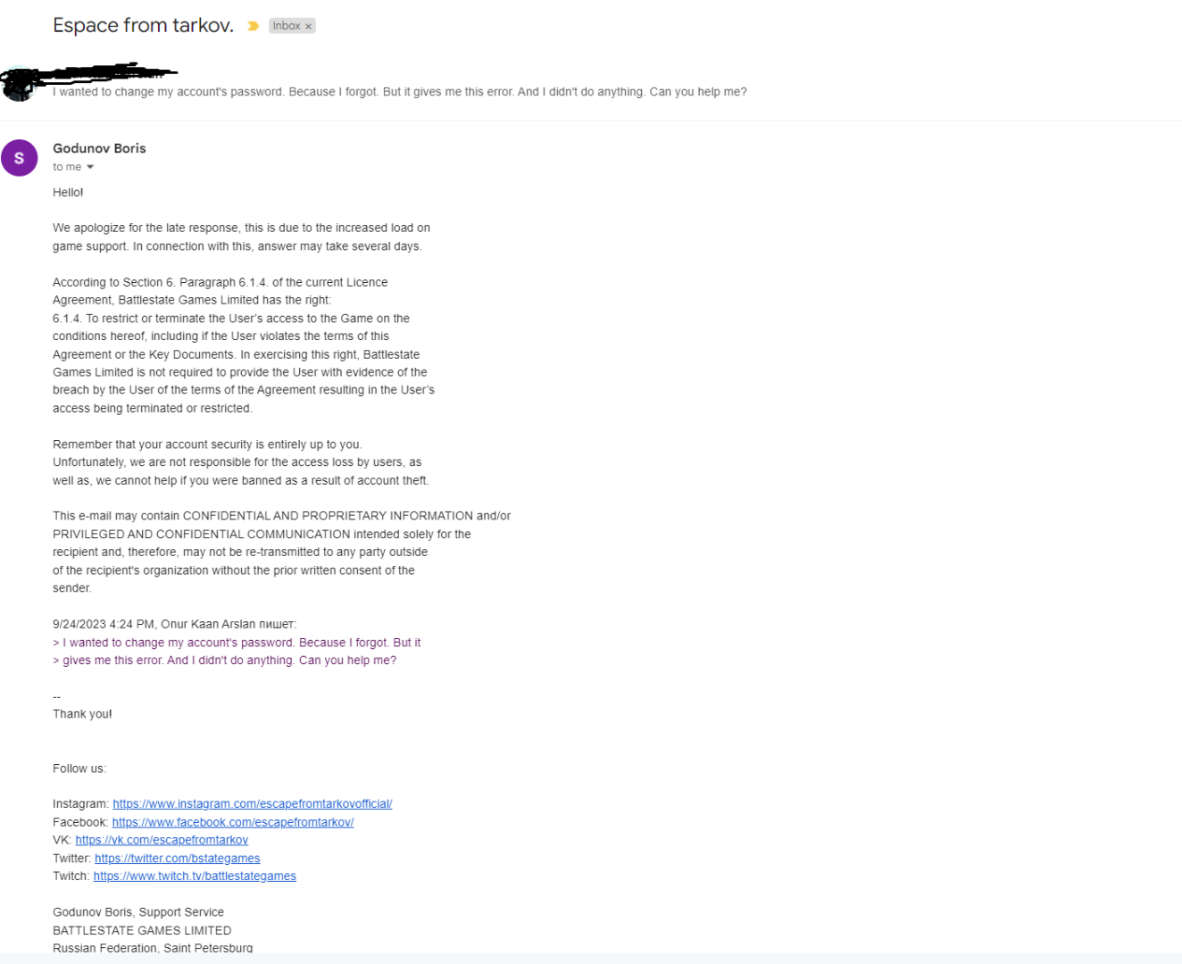 Ben geçen sene gittim Escape from Tarkov satın aldım. Euro üzerinden TL'ye güncel olarak dönen bir fiyatı vardı. Ve gerçekten pahalıydı. Hayatımdan dolayı giremedim edemedim oyuna vs. geçen gün başlamak istedim. Bir baktım 'hesabınız engellendi' gibi bir şey yazdı. Dedim Allah Allah, birkaç kez girdim ben bu oyuna. Neden şimdi öyle yaptı diye, şifre sıfırlama gönderdim. Baktım şifre sıfırlama maili geliyor ama tıklıyorum linki hata diyor. En son desteğe yazdım ve 'hesabınıza uzun zamandır girmediğiniz için, önlem maksatlı bu yasa gereği kalıcı olarak kaldırdık' dedi. Ve oyuna girmemekti tek suçum. Hile kullandın vs dese anlayacağım. Ben hayatımda böyle saçma sapan bir oyun şirketi görmedim. Hem param gitti. Hemde oyunu oynayamadım. Sözleşme de imza attırdık diyor. İşim gücüm yok 200 satır İngilizce pragrafı mı okuyacağım? Kimse okumuyor ki. Öyle böyle paramın üstüne yattılar. Uzun süre Escape from Tarkov oynamazsınız, hesabınız 'artık' güme gidiyormuş arkadaşlar. Fotoğrafta atıyorum.