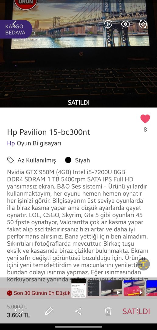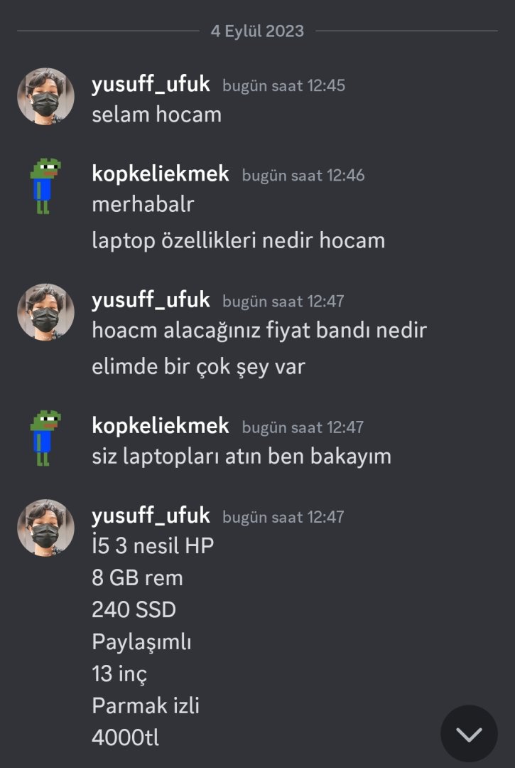 Ben size i5 7200u GTX950M cihazı 3600'e söyledim. Sizse i3 4.nesil ekran kartsız cihaza 4000 lira istediniz. Yazışmalar duruyor. İnternetten aldığım laptop duruyor. Kanıtlarını attım. Hiç utanmanızda yok arkadaşım. Hemende engelledin beni. Üstelik 'komiksin xD' yazarak engelledin. Belli ki küçük birisin.Aynen sıkıntılı kardeşim. 7. nesil i7 yi 3500 e aldın. Konuşma.