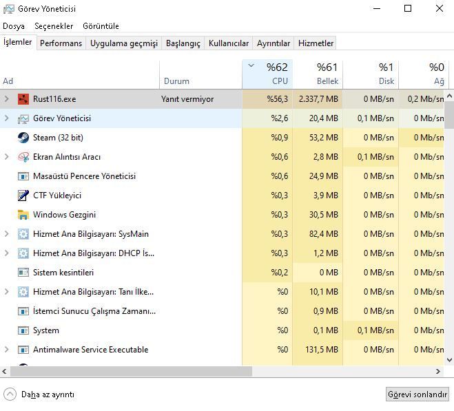Merhaba sistemim kötü olduğu için Rust devblog 116 oynayabiliyorum gönül ister ki Steam'de kütüphaneden güncel sürümünü oynayayım ama bilgisayarım pek müsaade etmiyor, aslında bakarsan eskiyi de oynayamıyorum. Oyuna giriyorum yaklaşık 2-3 dakika hiçbir sıkıntı olmadan çalışıyor adamla koşuyorum zıplıyorum sonra yanıt vermiyor Process Monitor ile sonuçları topladım anlayan biri yardımcı olabilir mi bu oyun neden yanıt vermiyor?