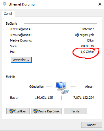 Yaptım biraz zaman geçtikten sonra tekrar güncelleyeceğim.Aygıt yöneticisi>ethernet>gelişmiş>speed duplex> 1 Gbps tam ikili yapıp deneyin.