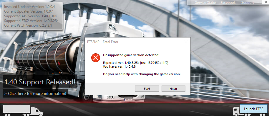 Sorum başlıktaki gibi ETS 2 son sürüm dün gece girdim ama bu sabah bu hatayı alıyorum. Betalardan 1.40.3.25v yok, güncelleme gelmesini mi bekleyeceğim?