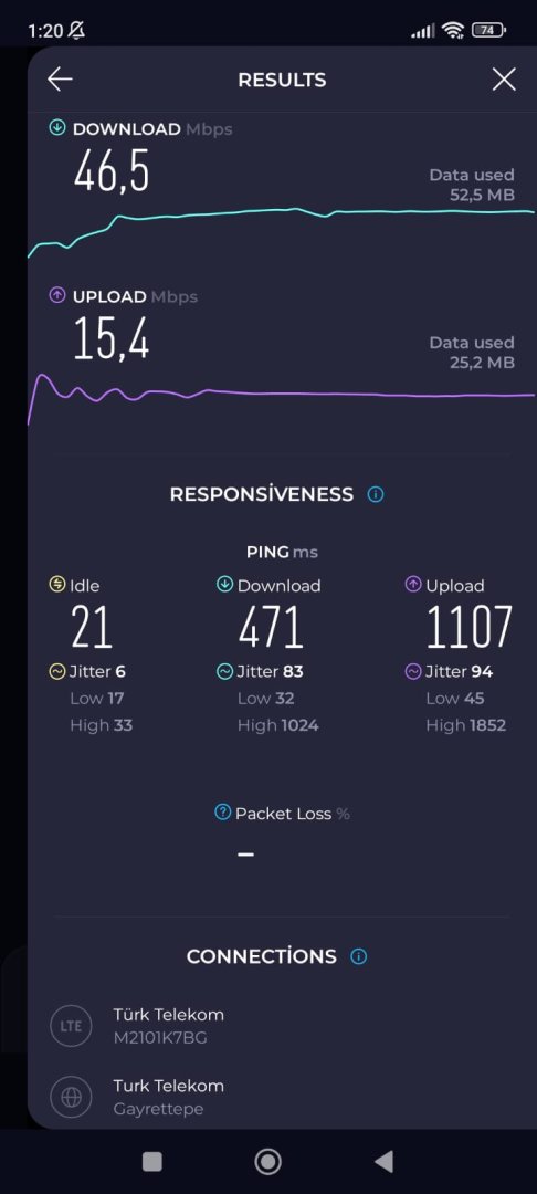 Evde LTE ortalama 7 Mbps, sokakta 2 ila 20 arası değişiyor. Elektrik gidince ise 0 Mbps.