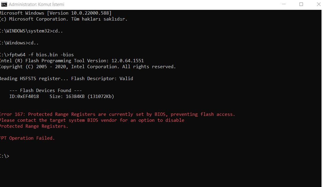 Error 167: Protected Range Registers are currently set by BIOS, preventing flash access. Please contact the target system BIOS vendor for an option to disable. Protected Range Registers.