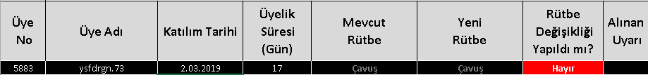 Deneyeyim hocamEvet bir sonraki rütbe zamanına kadar aynı kalır sonra değişir. Mevcut rütbe gün dolunca değişecek Yeni rütbe ise gün dolmadan 1 gün önce değişecek. Bizim uyarımız bu kısım olacak farklı olduğu zaman rütbe değişmedi "hayır" diyecek. 1 sonraki gün mevcut rütbeyi değiştirip aynı yaptığı zaman rütbe değişti "evet" diyecek.