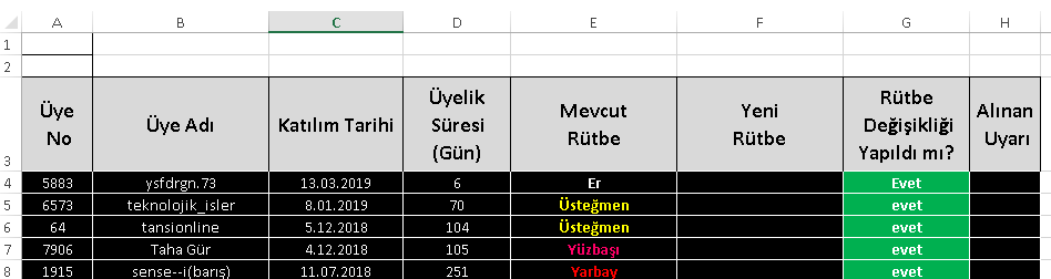Rütbe atlamaya 1 gün kala Yeni rütbe uyarısı çıkıyor. Günü gelince mevcut rütbe değişiyor ve değişen rütbe evet yanıtını alıyor. Siz kendi excel tablonuzda benim attığım tarihleri atar mısınız? Benimle aynı sonuçları almanız gerekiyor.
