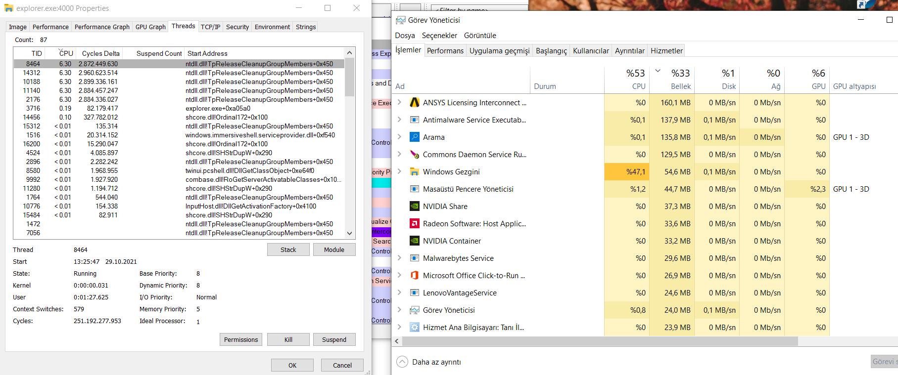 Merhabalar. Yaklaşık 2 gün önce böyle bir sıkıntı ile karşılaştım. SolidWorks adlı programda çizimlerimi yaparken dosyaları klasöre kaydediyordum. Bilgisayarı kapattım ertesi gün açtığımda SolidWorks dosyalarını kaydettiğim klasöre girince klasörün üstündeki çubukta yeşil şey(sarı ile boyanan kısım) dolmaya başladı ama sonuna gelmedi. Dolayısıyla içindeki dosyalarım küçük resim olarak beyaz gözüküyordu fakat dosyalar açılıyor.Ama görev yöneticisinde explorer.exe çok yüksek cpu kullanıyor