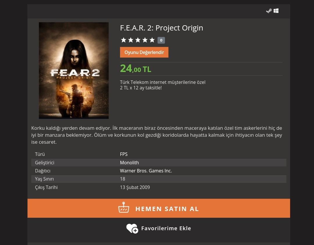 Playstore de F.E.A.R. 2: Project Origin 24 TL. Bence Fear serisinin en iyi oyunu bu fiyata kaçırmayın. Ben aldım key anında geldi.