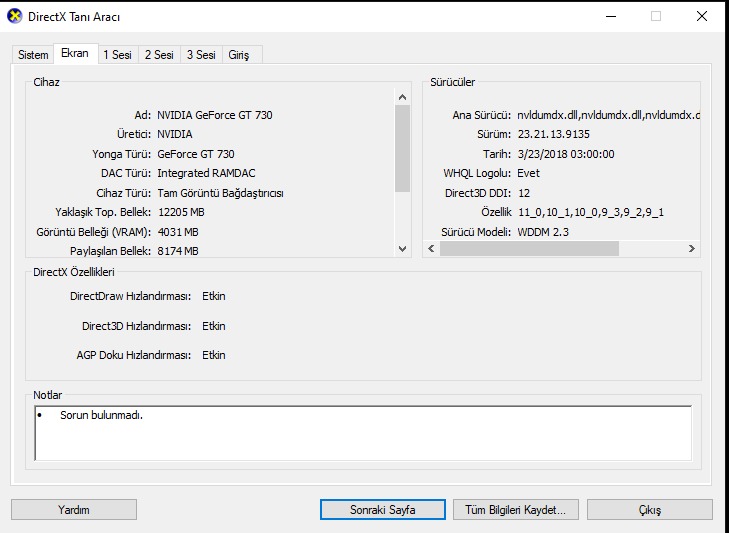Selam, arkadasim icin ekran karti bakiyoruz ama tam olarak sisteme hakim degiliz. DxDiag'dan baktik ama anakartin ismi belli degil o yüzden ne alacagimizi bilemedik. Şu an sistemde 16 GB RAM 1 TB M.2 SSD, ekran kartinda da GT730 var. Sistem bilgilerini de gorsel olarak iletiyorum asagida bu sisteme boyle fiyat olarak 1-3K arasi bir şey dusunuyoruz. Şu an tek oynanacak oyunlar Valorant, LoL ve benzeri oyunlar Valorant'ta iyi FPS alsa kafi yani. Şu an cunku 40-60 arasi aliyor ama cok drop yiyor ve aniden takılıyor 15-20 saniye falan.