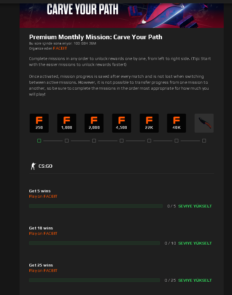 Günde 7-8 maç kazansan 1 ayda bıçak alırsın, ama iyi bir oyuncu olman lazım. FACEIT levelin düşükse rahat alırsın.