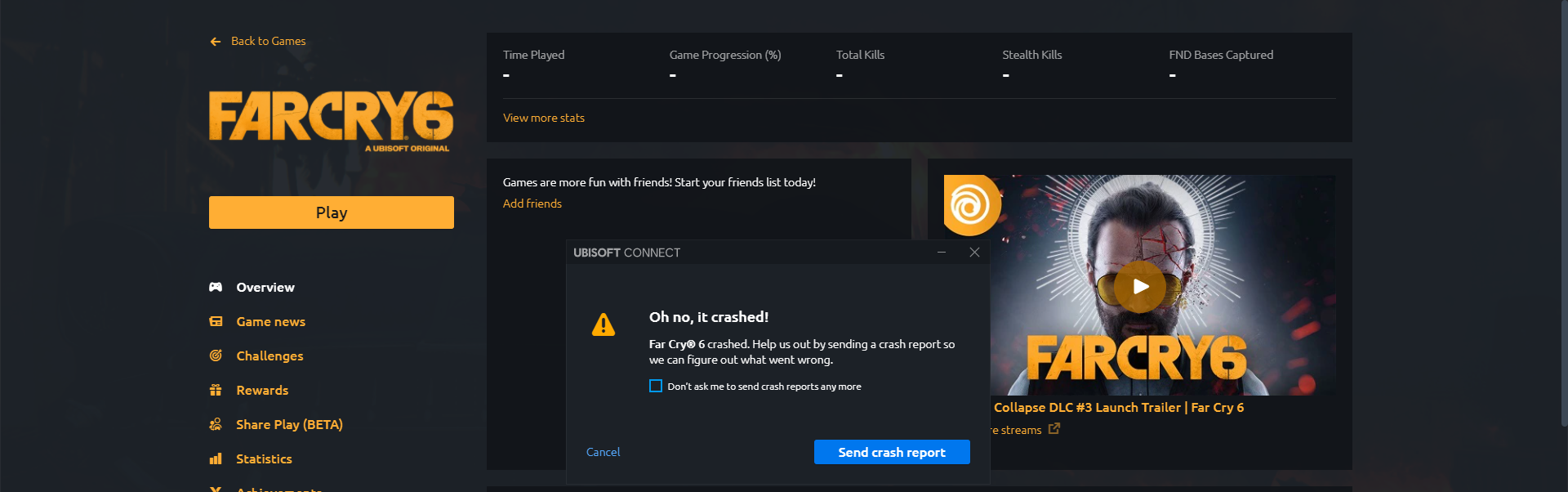Selamlar. Far Cry 6 oyununda crash hatasını almaktayım oyun çöküyor yani başlangıçta. Dosyaları doğruladım, klavye dilini İngilizce, italyanca hatta İspanyolca da yaptım ama sorun düzelmedi. Process Monitor ile rapor yaptım ama tam anlayamadığım ve tecrübeli olmadığım için sorunun nerede olduğunu anlayamadım. Yardımlarınız için şimdiden teşekkür ediyorum.