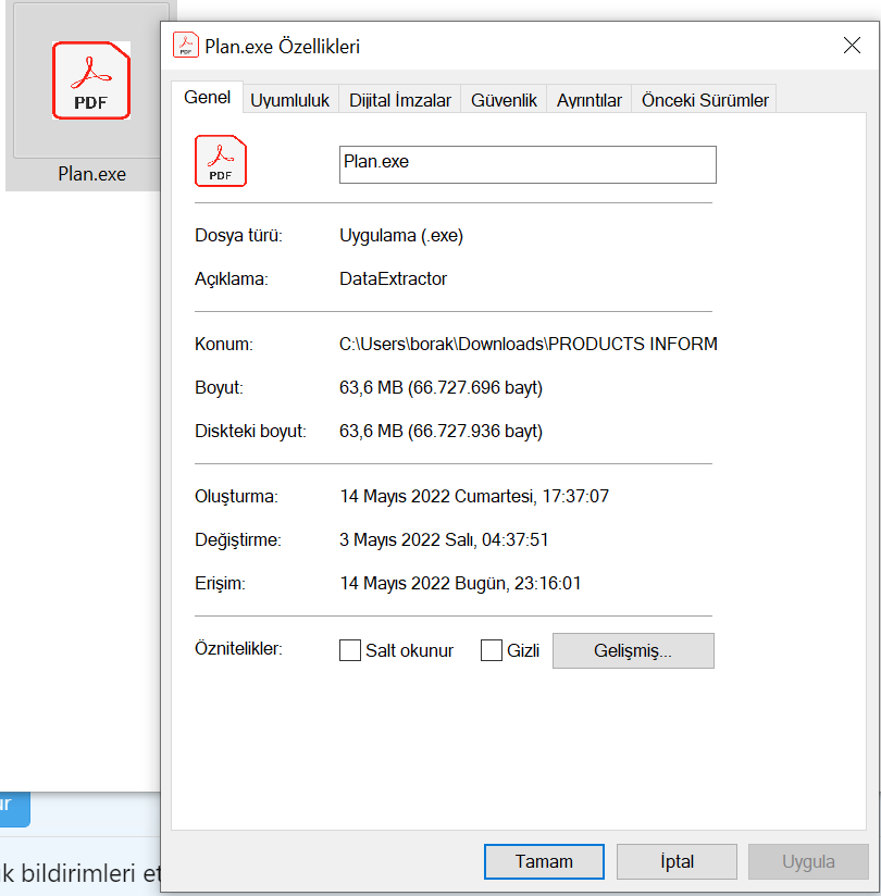 Bugün yeni bir müşterimle konuşurken, bir ZIP dosyası attı, ZIP dosyasının içinde birkaç resim ve şirketle ilgili bir PDF odluğunu sandığım bir dosya vardı. PDF dosyası zannedip açtım, açılmayınca bir terslik olduğunu anladım ve kontrol ettiğimde uzantısının exe olduğunu gördüm. Dosya türü olarak Data Extractor gözüküyor, Virus Total temiz aynı şekilde Norton Mbam ve Kaspersky ile de bilgisayarı taradım sonuçlar temiz çıktı. Ama bir türlü içim rahat etmiyor, inceleyebilirseniz sevinirim.