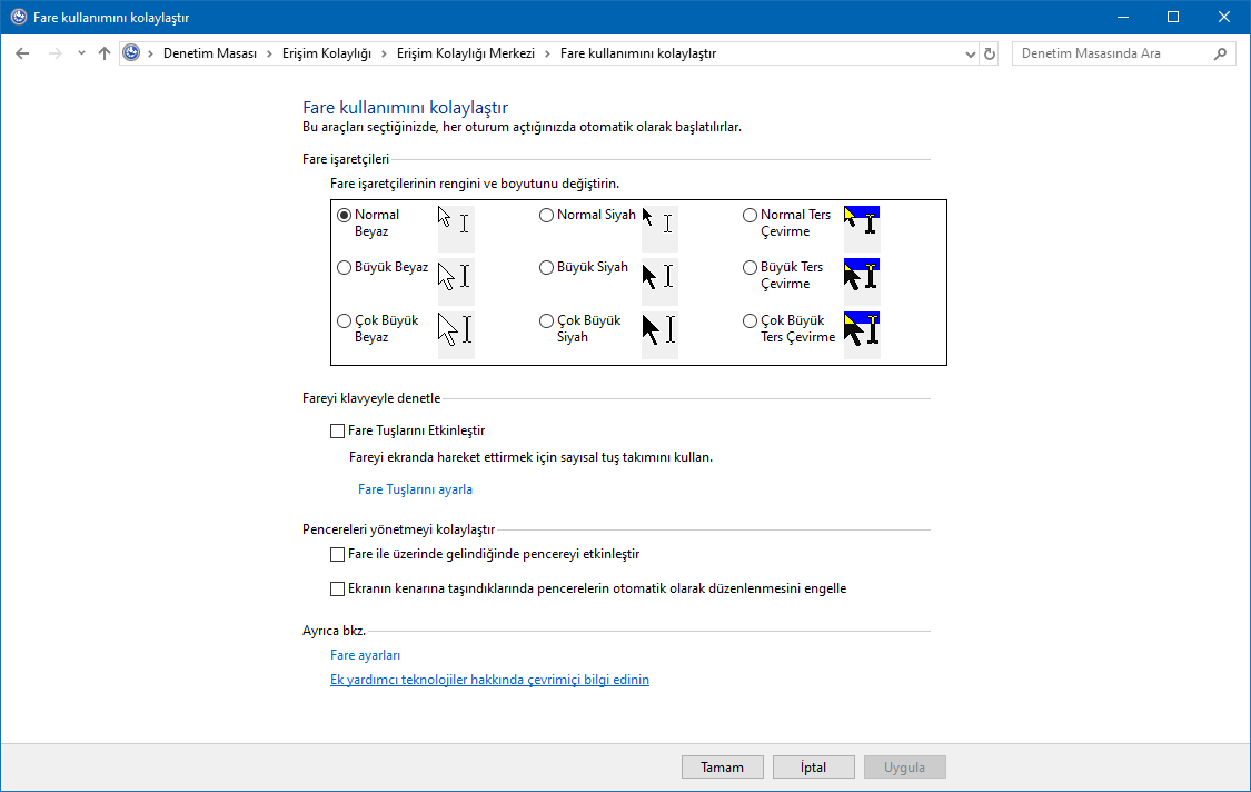 Orayı denedim. Olmadı.Denetim Masası\Erişim Kolaylığı\Erişim Kolaylığı Merkezi\Fare kullanımını kolaylaştır