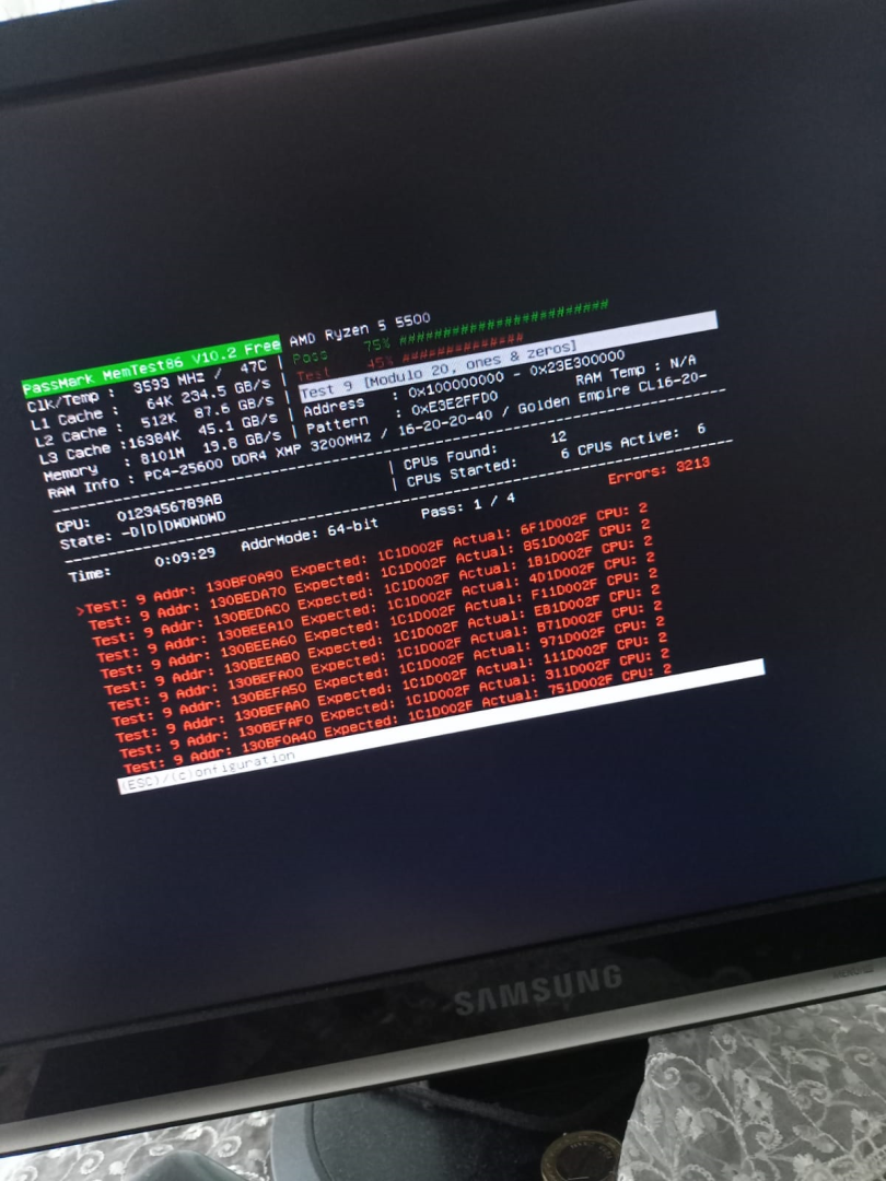 RAM'in birini çıkardım tek tek test yaptım birisi bu sefer daha testin başında 3213 hata verdi.