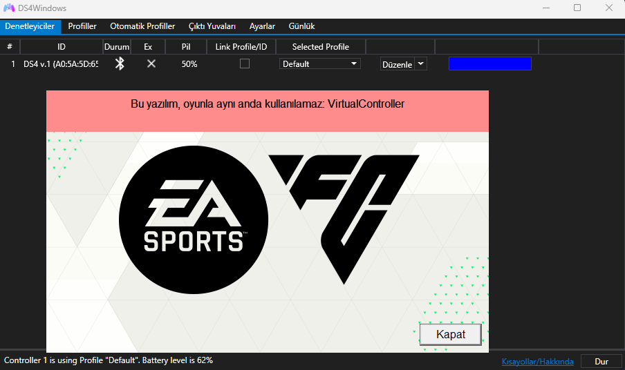 Merhabalar, ben fc 24'e konsol ile girmek için ds4windows adlı uygulamayı kullanıyorum bu uygulama konsolun algılanmasını sağlıyor ve uygulamayı açmadığımda konsol oyunda hiçbir tepki vermiyor. Ben her gün rahatlıkla fc 24'ü bu uygulama ile açabiliyordum ama dün fc 24'e girerken: "Bu yazılım, oyunla aynı anda kullanılamaz: VirtualController" hatası verdi bende ds4windows'u kapatıp girdim oyun açıldı ama konsol algılanmadı yani ds4windowsu açmam lazım bu hatayı nasıl düzeltebilirim?