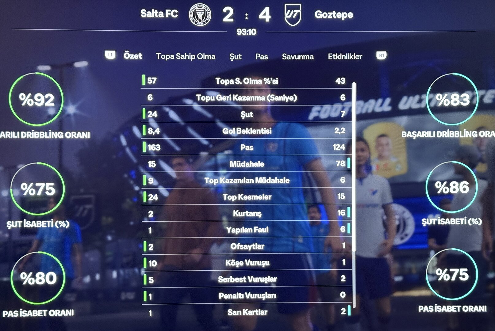 Top hep bende, topla oynayan benim, şutu çeken benim kaleciyle karşı karşıya en az 10 pozisyonum oluyor bu maç örnek mesela. 24 şutumun en az 15'i kaleciyle karşı karşıya pozisyonlar. Rakip 2 kez gelse 1'i gol oluyor benim kaleci tutamıyor. Div10'dayım daha yeni oyuncuyum asla galibiyet alamıyorum. Div10 rakipler bu kadar profesyonel olamaz diye düşünüyorum.