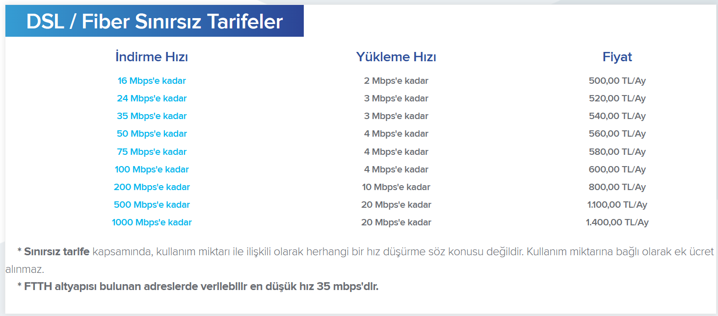 Şimdi de Türksat'ın TT altyapısından verdiği hızların listesi (Firma kendi inisiyatifinde TT'nin limitlerinden daha düşük hız veriyor):