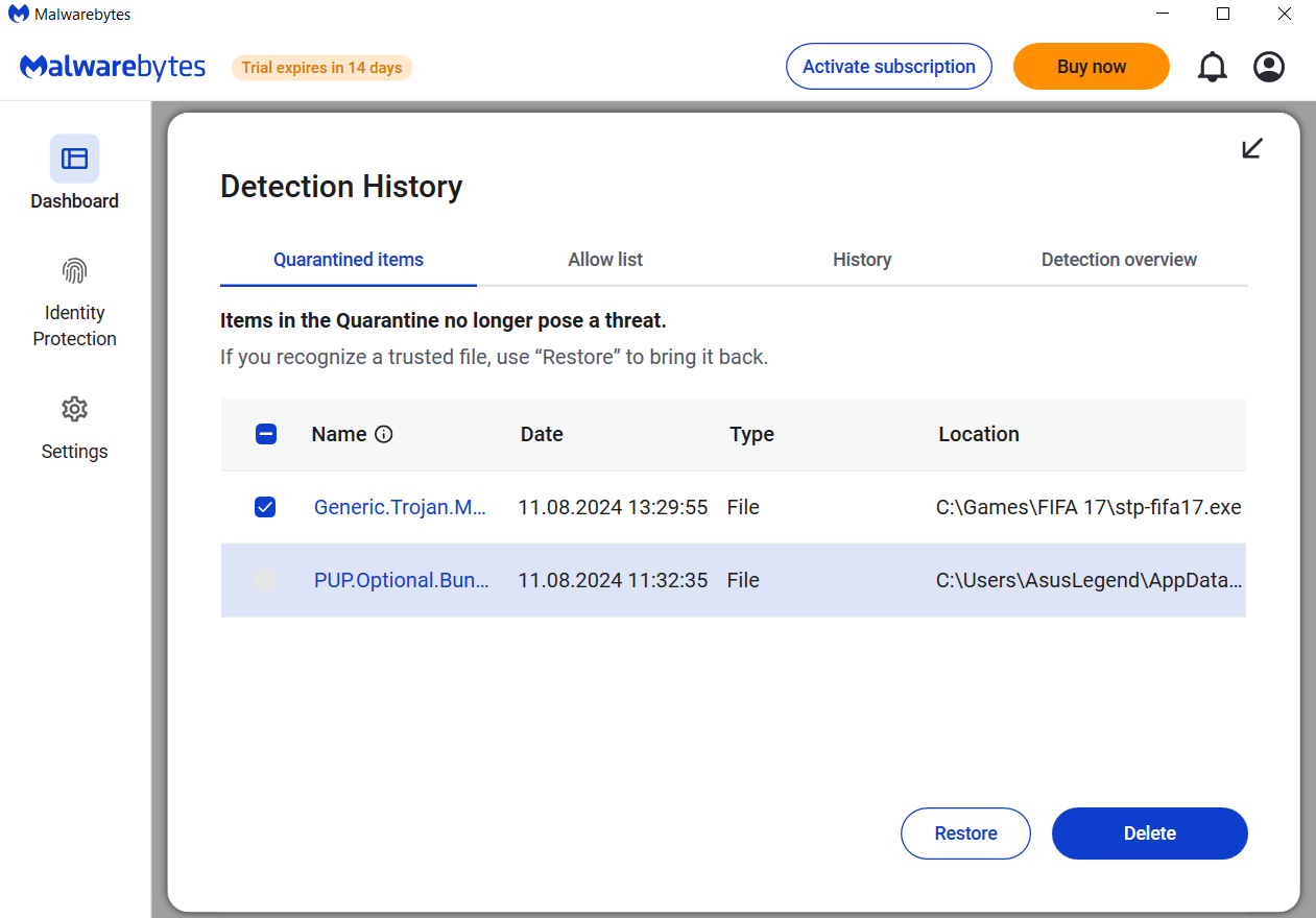 Dosyayı indirdim ve .exe dosyasını çalıştırmadan önce dosyayı VirusTotal'e attım. Sadece Risingden Malware.Undefined!8.C (CLOUD) geldi, sonra internette bunun false true olduğunu söylediler ardından çalıştırdım ve bekledim, oyun kuruldu fakat Malwarebytes 1 tane dosyayı karantina altına aldığı için oyun çalışmıyordu, bu dosyayı Malwarebytes Generic.Trojan.Malpack.DDS hatası verdi, hata verdiği dosya da C:/Games/FIFA 17/stp-fıfa17.exe dosyasıymış. Sizce dosyayı silmeli miyim yoksa restore'la geri mi almalıyım?