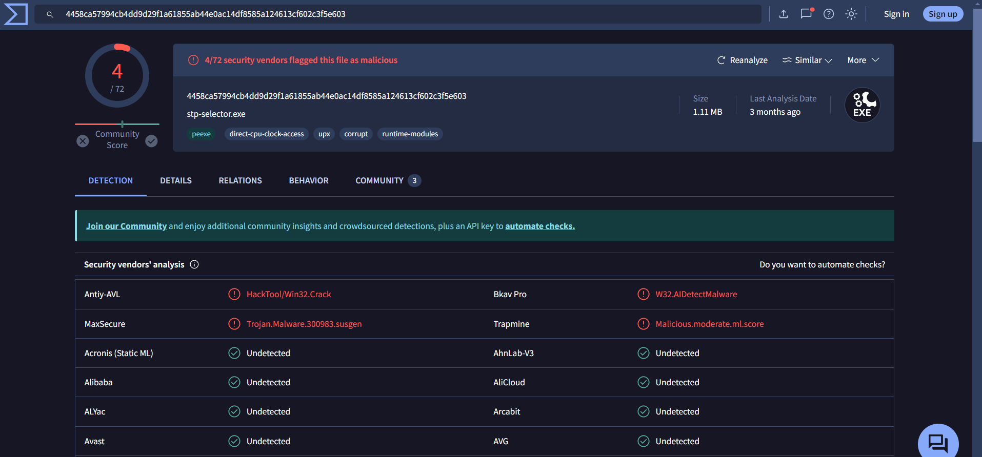 Bu sırada dosyalardaki STP Selector dosyasını Virustotal'e attım gailba karantinaya alınan dosyayla bağlantısı var böyle bir sonuç verdi, silmeli miyim?