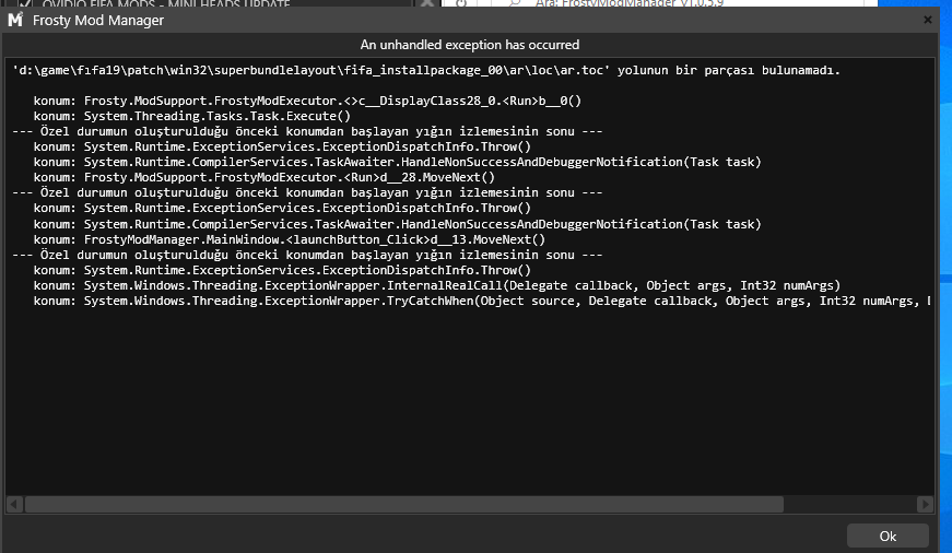 FIFA 19 Frosty Mode Manager "unhandled exception" hatası