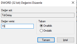 Sonra buna sağ tıkla değiştir de, değer verisine 15 yaz ondalık seçip kaydet orada sonra 21 yazacaktır sonra kapat PC'yi yeniden başlat.