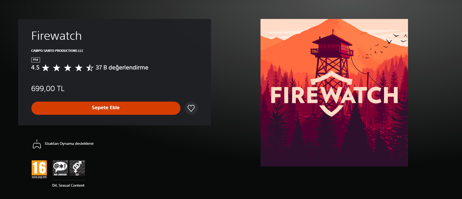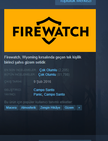 Firewatch sevmeyip de yine de hikaye tarzı oyunlar oynamak istiyorsanız The Long Dark, The Stanley Parable ve Fears to Fathom gibi oyunlar güzel. Katılıyorum firewatch denilen kadar ihtişamlı bir oyun değil fakat arkadaşların dedikleri gibi zamanında çıktığında Telltale oyunları kadar klas görülüyordu. Bence oyun Metacritic'teki 81 değerini hak ediyor, tam da iyi bir reyting.