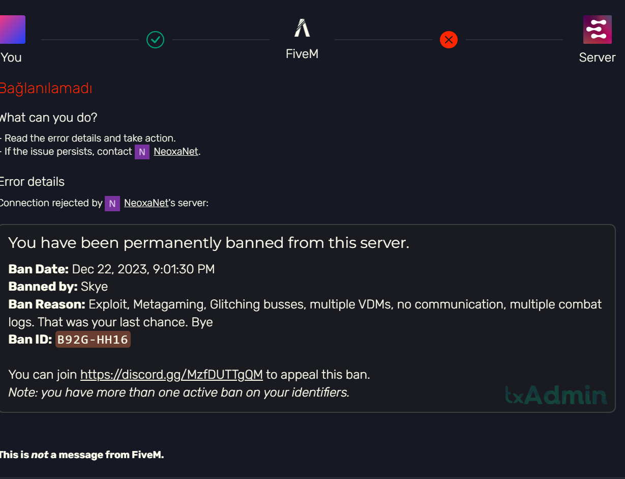 Merhaba, ben FiveM'de HWID banı mı yedim? Anlamadım, yardımcı olur musunuz? Yoksa hesap değiştirsem tekrar girebilir miyim?