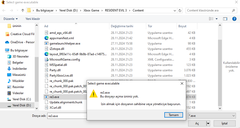 Resident Evil 3 için Türkçe yama yapacağım ve bunun için ise Fluffy Mod Manager lazım. Bu programı kurdum ve oyunun EXE dosyasını seçmemi istiyor ben de bulup aç diyorum ve sonrasında bu dosyayı açma yetkiniz yok hatası alıyorum.