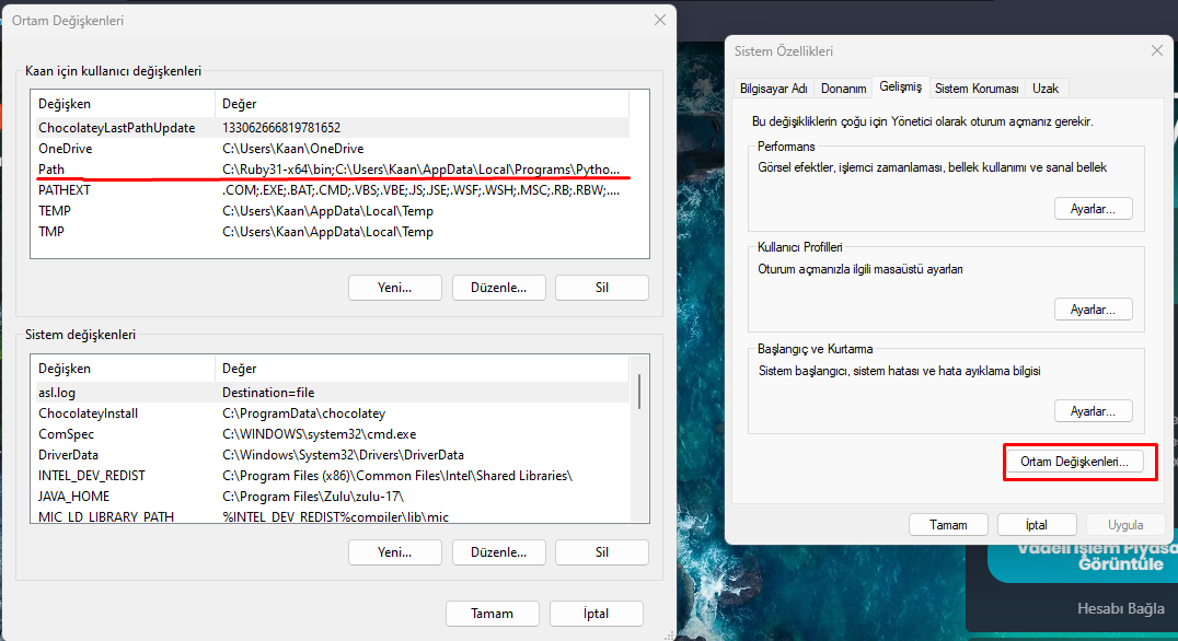 Sonra başlat menüsünde ortam değişkenliklerini aç.