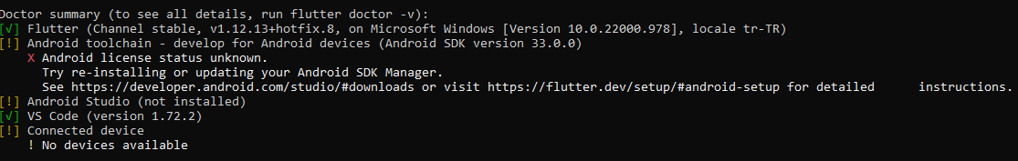 Android Studio üzerinden sanal makine aç, sonra VS Code'da CTRL+Shift+p ile yeni Flutter projesi aç. Varsayılan olarak gelen kod sorunsuz çalışıyorsa sorun yoktur demek.