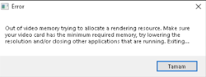 Out of video Memory trying to allocate a rendering resource hatası alıyorum. Çözünürlüğü düşür diyor.