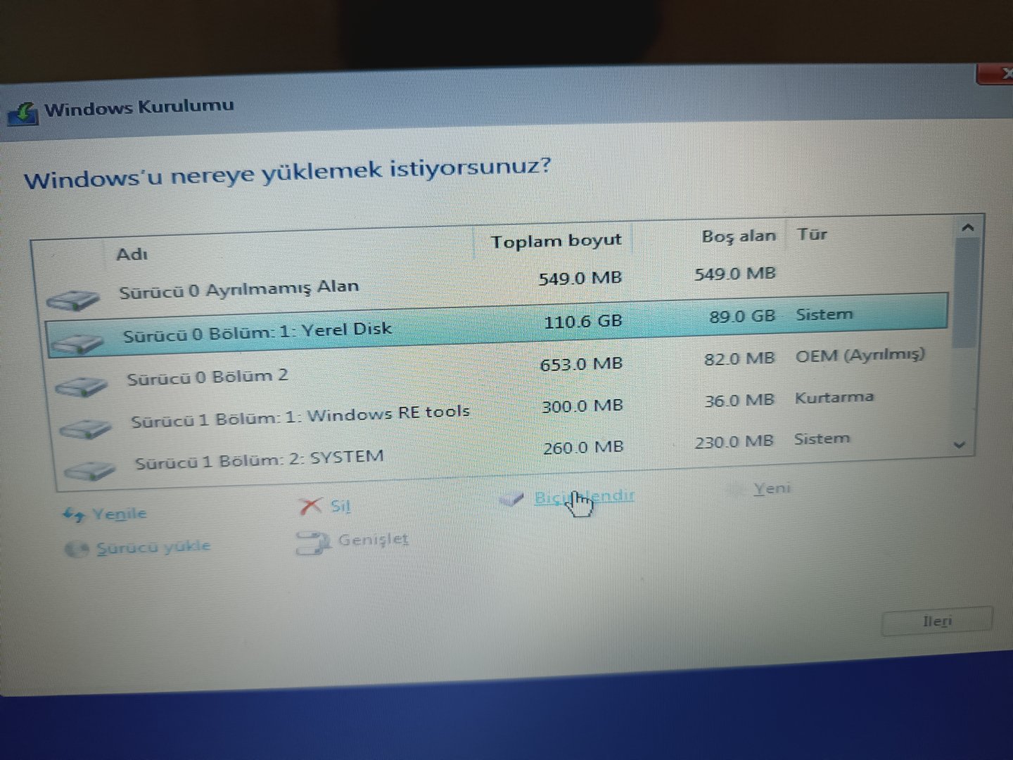 Evde kendi başıma format atmayı deniyordum ve bu ekran çıktı. Hangi diski biçimlendireceğimi bilmiyorum. Sistem dosyalarını da silmek istemiyorum. Yardım eder misiniz?