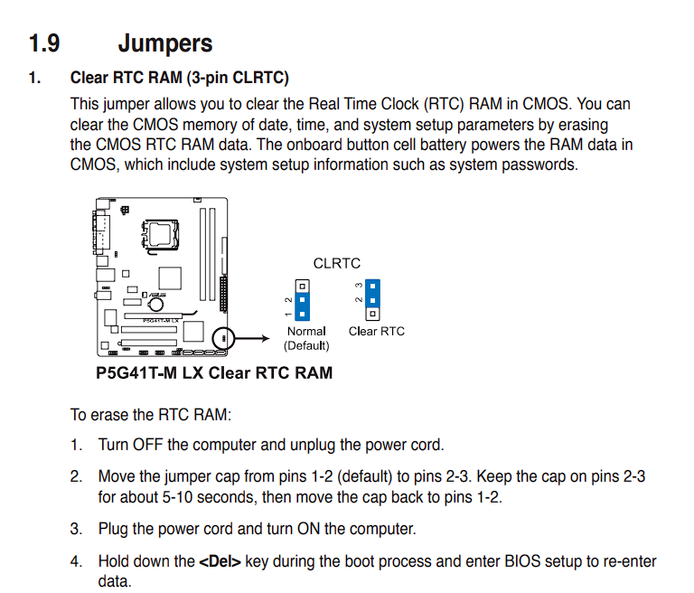 Jumper'ı normal konumdan Clear RTC konumuna alın ve 5-10 saniye bekleyip eski konumuna getirin.
