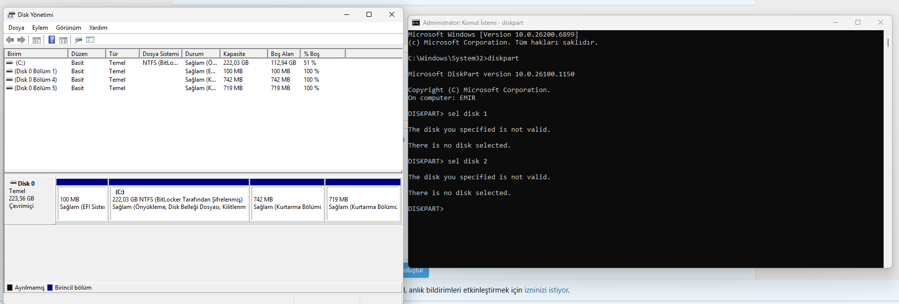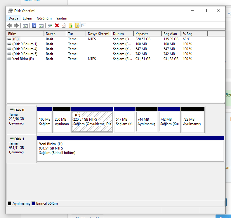 Windows tuşuna tıklayıp sabit disk oluştur ve biçimlendire tıkladım, ayrılmamış disk ibaresi göremedim.