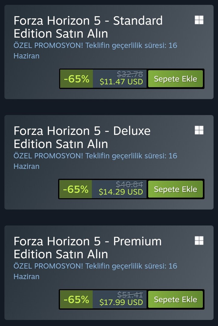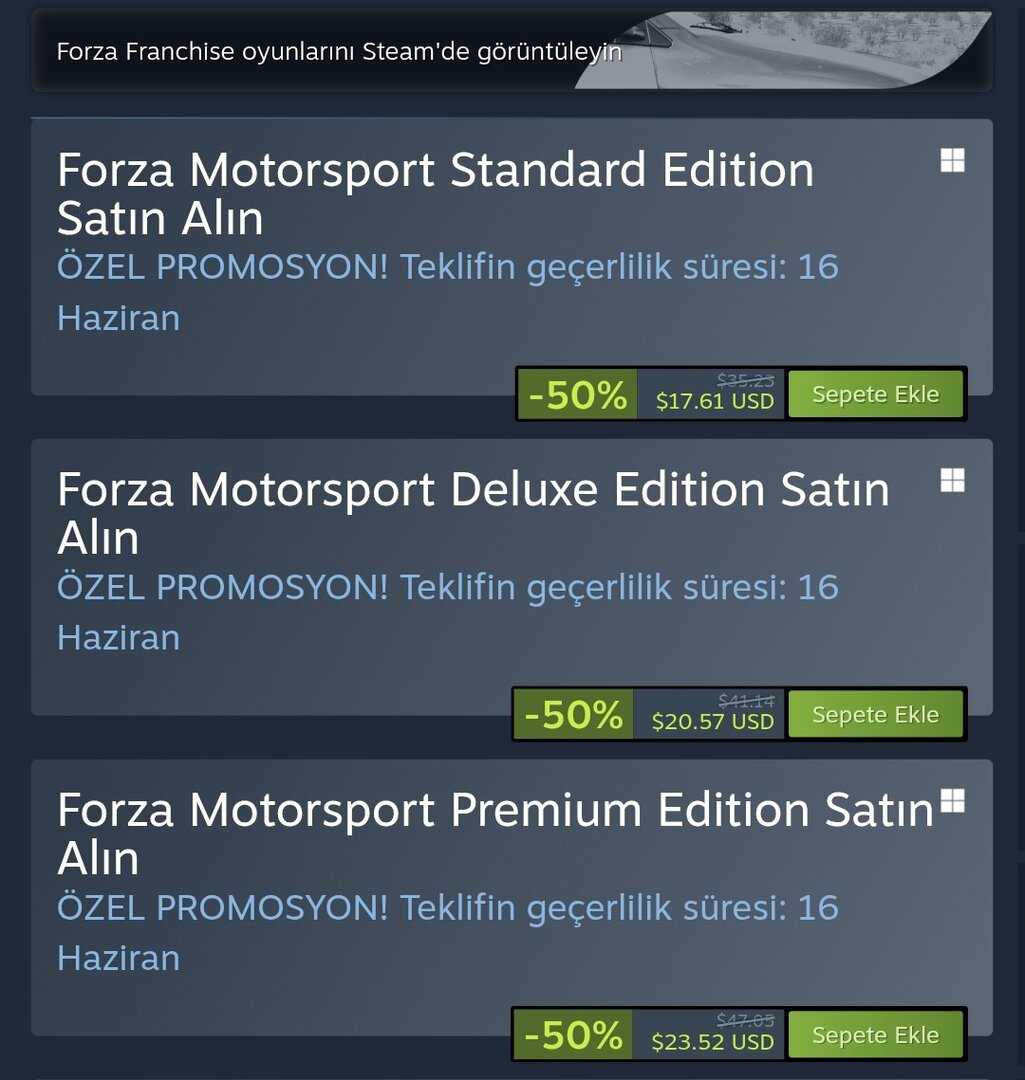 Büyük ihtimal Xbox Showcase'den dolayı düşmüştür diye düşünüyorum. Bir de bir şey fark ettim Forza 4'e sahip olmayıp ilk defa Forza 5 alacak bir kişi tüm paketleri %50 indirim ile oluyor. Ama tam tersi Forza 4 olup Forza 5 alacak bir kişi paketleri %65 indirime sahip oluyor. Bu durum Forza Motorsport içinde geçerli tüm paketlerde %65 indirim oluyor. Bence çok şahane bir olay. Ne düşünüyorsunuz?