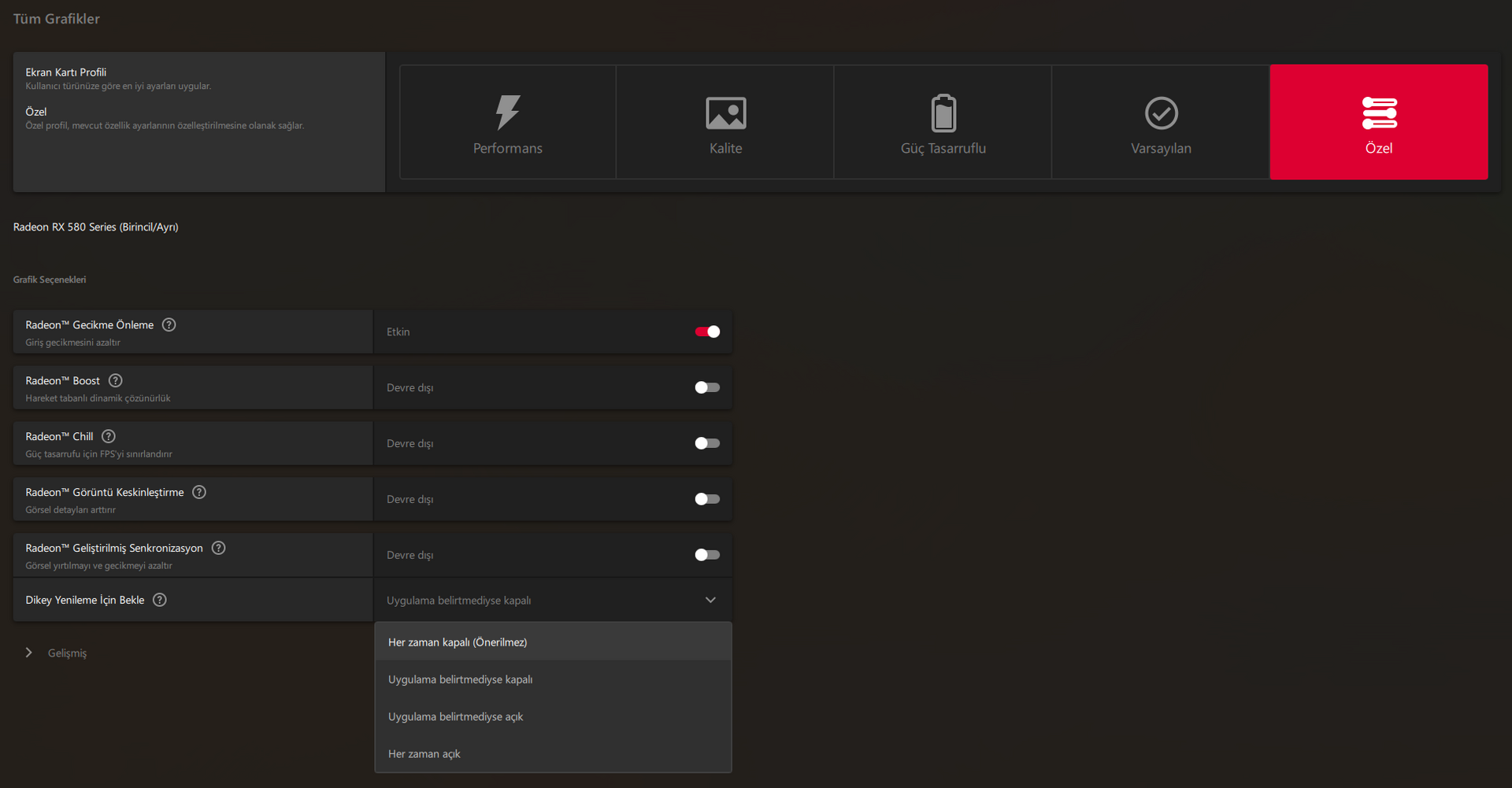 AMD Adrenalin>Oyun>Ekran Kartları>Dikey Yenileme için Bekle = Her zaman kapalı
