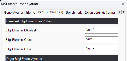 Verdiğim görselde orta kısımda OSD'de göster diye bir seçenek var. Tiklerini açtığınız değerler için OSD'de göster kutucuğunu da işaretlemelisiniz. Bunu yapmak unutulur genelde.