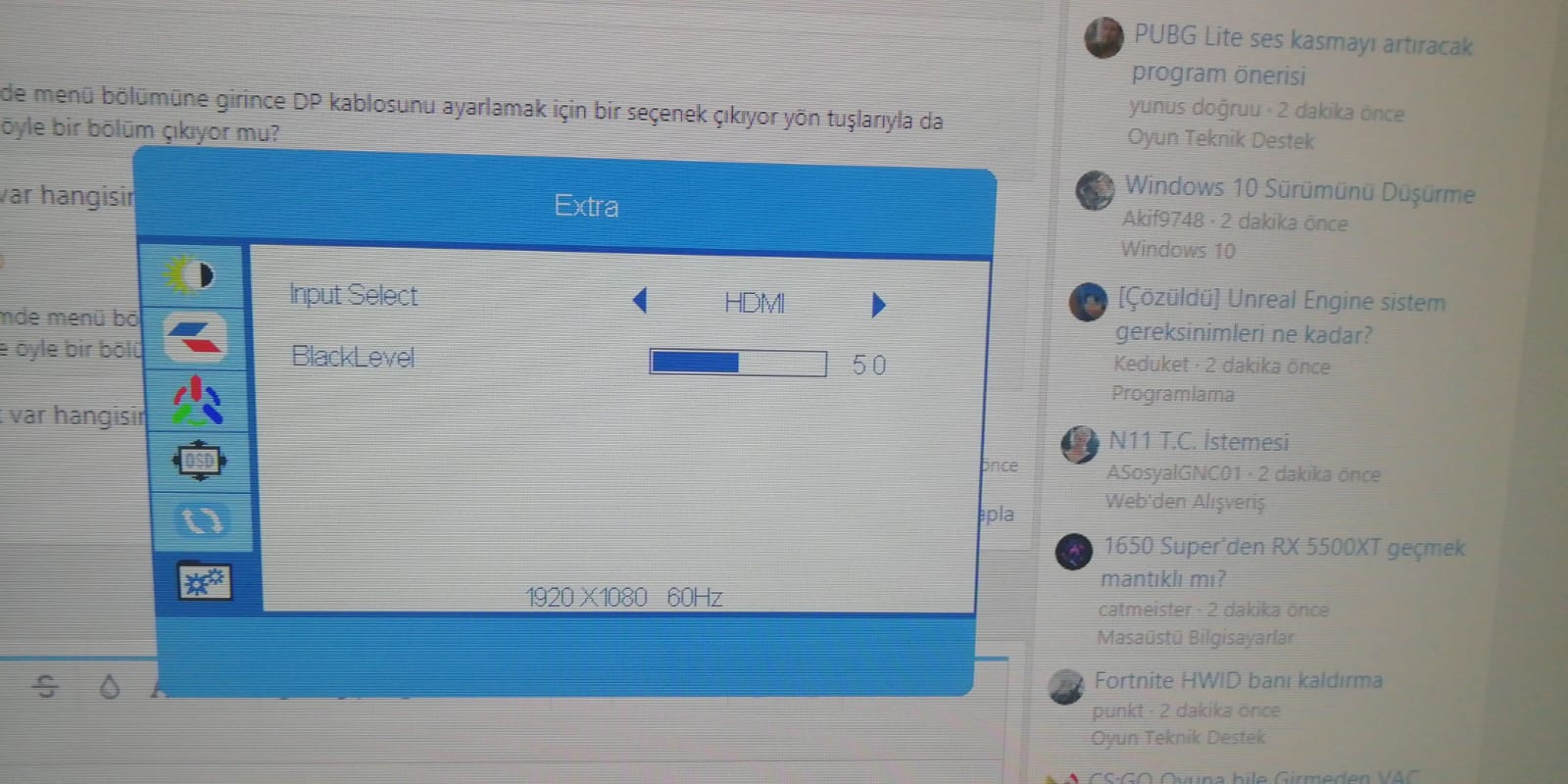 Benim monitörümde menü bölümüne girince DP kablosunu ayarlamak için bir seçenek çıkıyor yön tuşlarıyla da ayarlıyorum sizde öyle bir bölüm çıkıyor mu?