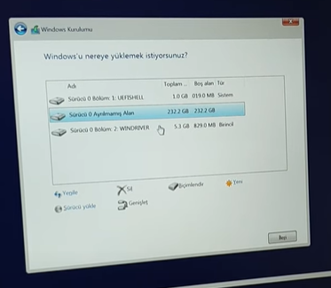 Eğer size gelen bilgisayarda tek bir disk varsa (meslea 1 TB SSD) benim dediğiim şekilde, bu bölümde tümünü silerseniz Windows kurulunca sadece D diskiniz kalır ve Windows ona kurulur.